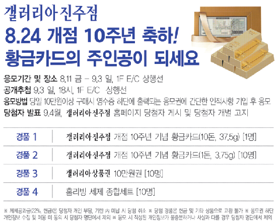 갤러리아백화점 진주점은 11(금)부터 다음달 3일까지 당일 10만원 이상 구매 고객 대상으로 추첨을 통해 1등(1명) 개점 10주년 황금카드(10돈, 37.5g), 2등(10명) 황금카드(1돈, 3.75g), 3등(10명) 갤러리아상품권 10만원, 4등(10명) 홈리빙세제 종합세트를 사은품으로 제공한다.