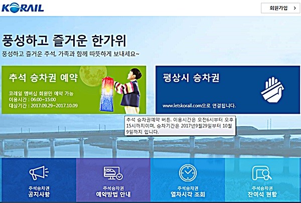 홈페이지로 추석 기차표 예매 방법은 예약 접속 대기 후(대기 순서에 따라 자동 접속) 코레일 멤버십번호로 로그인한 후 즉시예약 혹은 잔여석 조회예약이 가능하다. 즉시예약의 경우 회원정보와 승차인원, 열차정보 등을 입력하고 예약 요청을 하면 된다.