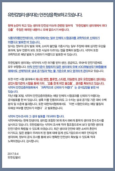 끝으로 유한킴벌리는 “식약처 조사에 적극적으로 협조해 더 엄격한 생리대 안전기준이 확립될 수 있도록 노력할 것”이라고 말했다.