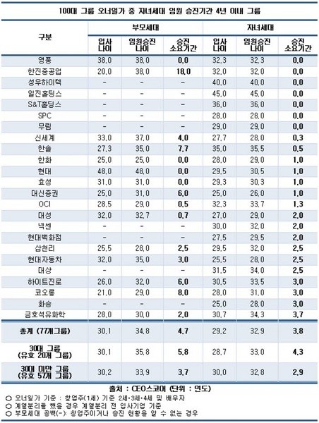 임원 승진 기간은 부모세대보다 자녀세대로 올수록 짧아졌다. 재계 1~2세대가 주로 해당되는 부모세대(공정거래위원회 동일인 기준)는 평균 30.1세에 입사해 4.7년 후 임원으로 승진했지만, 3~4세대로 분류되는 자녀세대는 29.2세에 입사해 고작 3.8년 만에 임원을 달았다.