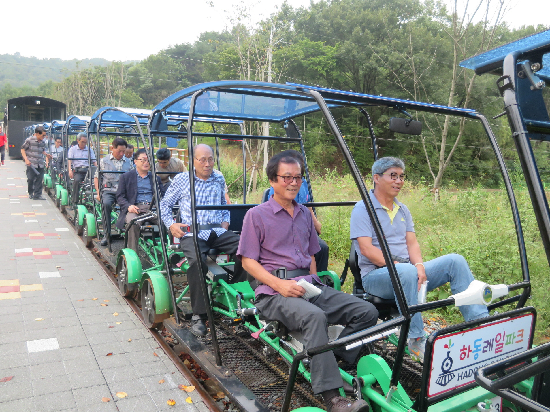 레일바이크에 탑승한 이장들은 연령대가 높은 탓에 처음에는 페달 밟기가 쉽지 않았지만 전동페달로 불편을 덜 수 있었고, 25㎞ 이상일 경우 자동 브레이크시스템으로 안전하게 이동할 수 있어 주변의 아름다운 풍경을 감상하며 레이바이크를 즐겼다.