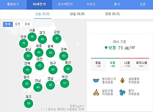 한편 이날 오전 10시 기준으로 서울은 미세먼지 보통(56㎍/㎥) 수준을 기록하고 있다. 경기68, 인천75, 강원47, 대전55, 대구63, 광주39, 부산57, 제주38 로 역시 보통 수준이다.