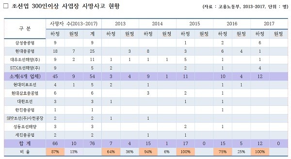 국회 환경노동위원회 이정미 의원(정의당 비례대표)이 고용노동부에서 받은 ‘조선업 300인이상 사업장별 사망사고 자료’를 보면, 올해 삼성중공업 크레인사고로 6명(5월1일), STX 조선해양 화재사고 4명(8월20일), 현대중공업 1명, 대우조선해양 1명 등 12명의 사망사고 모두 하청노동자였다.