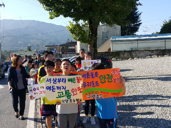 이어 경찰차의 호위를 받으며 악양삼거리 주변을 돌며 지역주민들에게 학교 주변 안전 확보를 위한 리플렛과 홍보물을 나눠 주고 자살, 폭력, 교통사고 없는 안전한 고장을 만드는데 동참할 것을 유도했다.