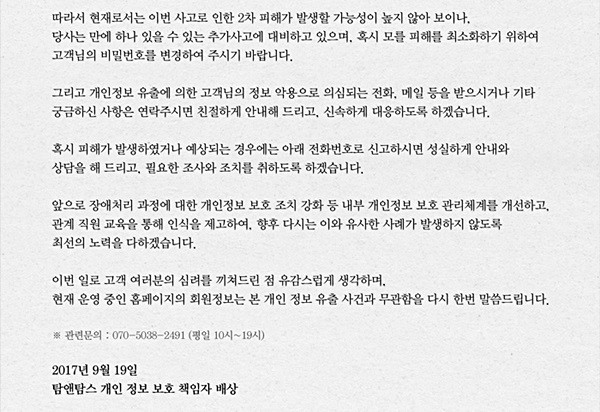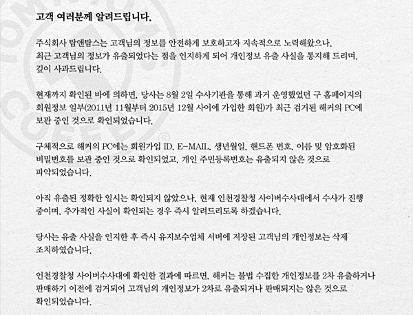 한편 현재 운영 중인 탐앤탐스의 홈페이지는 이번 개인정보 유출 사건과는 무관한 것으로 알려졌다.