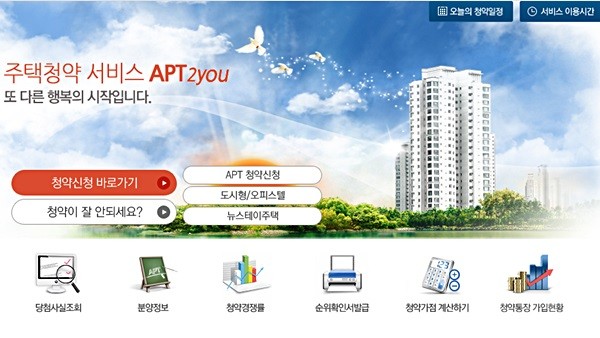 아파트투유는 금융결제원이 운영하는 아파트와 오피스텔 등 신규 주택에 대한 청약을 신청할 수 있는 사이트다. 주택청약종합저축, 청약저축, 청약예금, 청약부금 등 청약통장에 가입한 사람이라면 신청 자격이 주어진다.