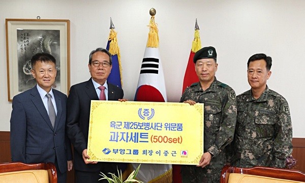 이날 최양환 부영주택 대표이사 등 부영 일행은 경기도 양주에 위치한 국군 제25보병사단 본청 2층 환담실에서 국군 제25사단 안영호 사단장(소장)을 만나 과자선물 500세트의 위문품을 기증했다.