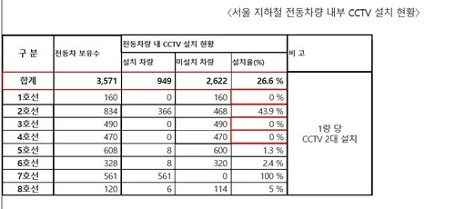 국회 행정안전위원회 소속 황영철 의원(바른정당)이 서울지방경찰청과 서울교통공사로부터 제출 받은 자료에 따르면 서울 지하철 1~8호선 전동차 3571량 가운데 CCTV를 설치한 전동차는 949량에 불과해 설치율이 26.6%에 그쳤다. 미설치 차량은 2622량이었다.