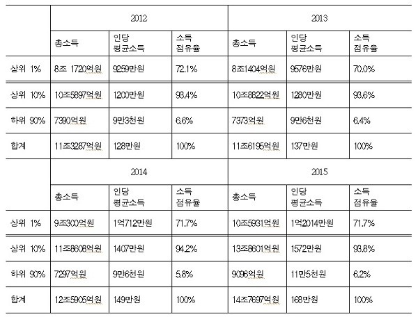 상위 10%의 배당소득 집중도를 살펴보니 양극화가 극명하게 드러났다. 상위 10%의 전체 배당소득 점유율은 2012년 93.4%에서 2013년 93.6%, 2014년 94.2%, 2015년 93.8%로 박근혜 정부 이전보다 박근혜 정부 이후 쏠림 정도가 더욱 커졌다.