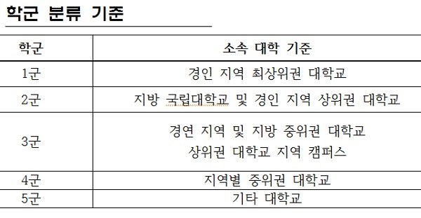 대우조선해양의 ‘학군 분류 기준’에 따르면 출신 대학을 1∼5군으로 구분했다. 1군 경인 지역 최상위권 대학교, 2군 지방국립대학교 및 경인 지역 상위권 대학교, 3군 경인 지역 및 지방 중위권 대학교 및 상위권 대학교 지역 캠퍼스, 4군 지역별 중위권 대학교, 5군 기타 대학교 등이다.