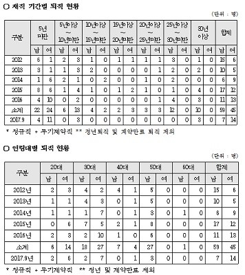 실제 지난 2012~2017년 9월까지 퇴직자들을 성별로 살펴보면, 남성이 66명(52.8%), 여성이 59명(47.2%)로 비슷하지만 전체 퇴직자의 43.2%, 여성 퇴직자의 91.5%가 20~30대 여성(54명)이였다.