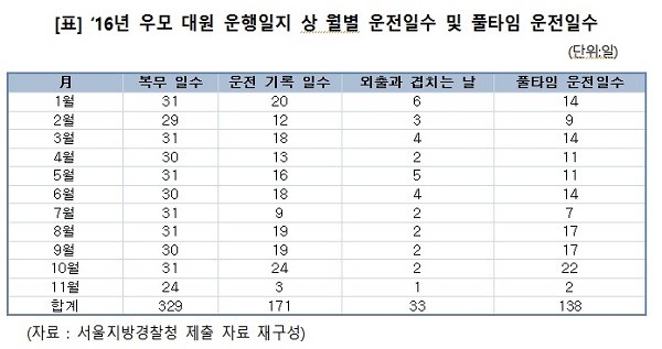 특히 최순실 국정농단 등으로 집회 시위가 몰렸던 11월에 풀타임으로 운전한 날은 단 이틀 뿐이었다.