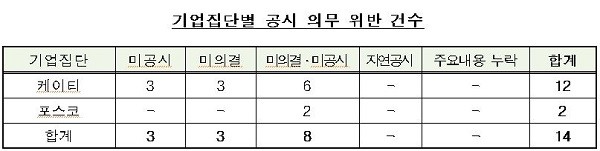 그러나 이번에 공정위가 점검한 3개 기업집단에서 KT&G를 제외한 케이티와 포스코 기업집단은 공시 의무를 위반한 것으로 점검 됐다.