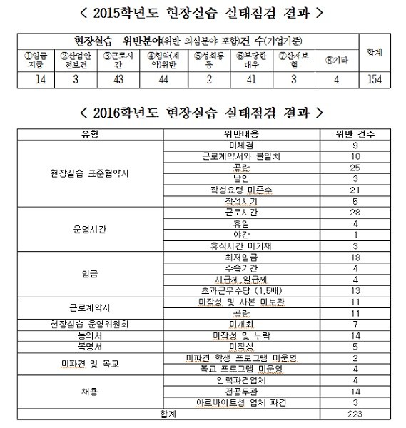 경기도 교육청이 국회 교문위 소속 이철규 국회의원(자유한국당, 강원 동해‧삼척)에게 제출한 ‘특성화‧마이스터고 현장실습 실태점검 결과보고서’에 따르면, 2015년 154건(112개교)이던 현장실습 위반 사례가 지난해에는 223건(111개교)으로 45% 증가했다.