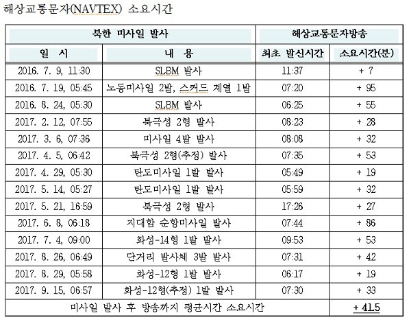 이군현 자유한국당 의원(농림축산식품해양수산위원회)이 해양경찰에서 받은 ‘해상교통문자방송 실시현황’에 따르면, 2016년 7월 이후 북한 미사일 발사 관련 총 40회 해상교통문자방송을 했고, 평균 41분 30초 소요된 것으로 나타났다.