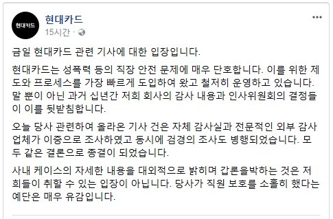 [일요주간=김완재 기자] 한샘에 이어 ‘사내 성폭행 논란’이 일고 있는 현대카드가 사회관계망서비스(SNS) 페이스북을 통해 “매우 유감”이라는 공식 입장을 밝혔다.