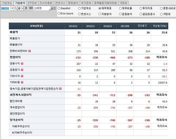 신라젠은 실적을 확인할 수 있는 지난 2014년 이후 단 한 번도 이익을 낸 적이 없다. 2014년에는 151억 원의 영업손실을 기록했다. 2015년(-237억 원), 2016년(-468억 원) 등 3년 연속 적자에서 벗어나지 못했다. 올해도 3분기 누적 영업 손실이 371억 원에 달한다.