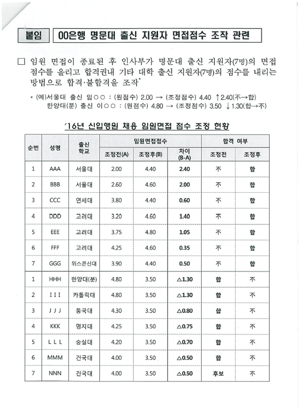 해당 자료에 따르면 서울대 출신 지원자 A씨는 면접점수가 2점밖에 안 돼 불합격권에 있었지만 4.4점으로 조작돼 최종 합격자 명단에 들어갔다. 고려대 출신 B씨도 3.2점에서 4.6점으로 점수가 조작돼 올라갔다. 이렇게 점수 조작으로 최종 합격하게 된 지원자는 총 7명으로 서울대 2명, 연세대 1명, 고려대 3명, 위스콘신대 1명이었다.