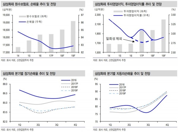 김 연구원은 ”삼성화재는 2018년 목표로 상품 개발 및 신계약 확대를 통한 시장지배력 회복을 제시해 경쟁 초기 사업비는 증가는 불가피하겠으나, 선도사 프리미엄을 고려하면 경쟁사 수준의 시책에서 동사의 신계약 규모 회복 가능성 은 높다고 판단되며 이는 2018년 신계약가치 증가에 긍정적으로 기여할 전망이다“라고 분석했다.