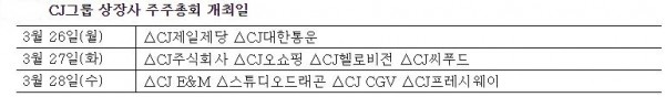 CJ그룹은 당초 3월 23일 전 계열사가 일괄 주주총회를 개최할 계획이었으나 주총 집중 예상일을 피해 3월 26, 27, 28일 총 3일간 분산 개최할 예정이다.