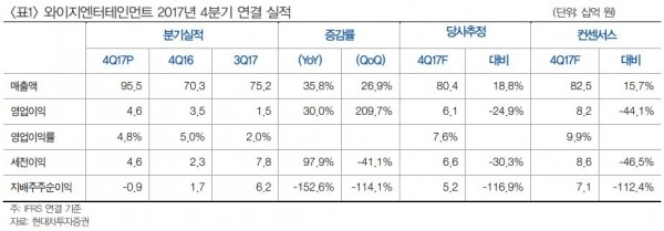 현대차투자증권이 YG엔터테인먼트의 4분기 실적에 대해 “부진한 실적”이라며 “매출액은 955억원(YoY +35.8%), 영업이익은 46억원(YoY +30.0%)으로 당사 예상치 와 시장 컨센서스를 크게 하회하는 어닝쇼크를 기록했다”고 밝혔다.