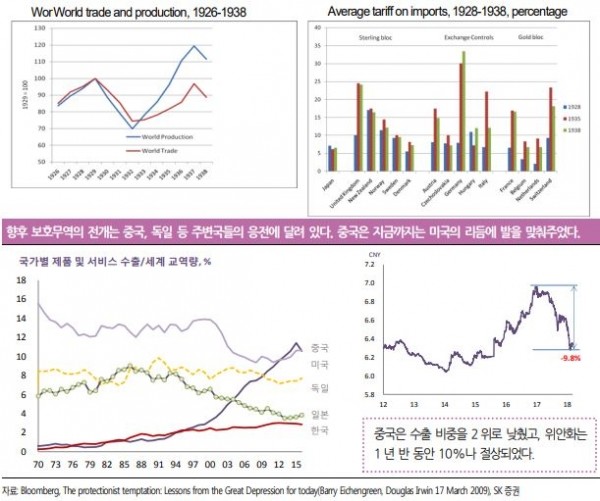 그는 또 “향후 보호무역의 전개는 트럼프의 선전포고보다 중국, 독일 등 주변국의 응전에 달려 있다. 1930년대 세계 경기가 엄청난 폭의 위축을 겪은 것 역시 국가들의 경쟁적인 관세 인상이 주요 이유였기 때문이다. 1928년 10%를 하회했던 독일의 관세율은 1938년에는 35%에 가까운 수준으로 높아 졌었다”고 말했다.