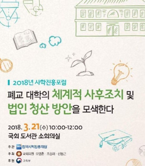 [일요주간=이수전 기자] 오는 21일 국회도서관 소회의실에서 '폐교 대학의 체계적인 사후 조치 및 법인 청산 방안'에 대한 사학진흥포럼이 개최 예정이다.