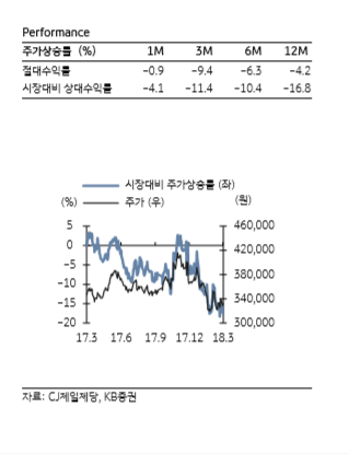 이창민 KB증권 연구원은 23일 CJ제일제당의 1분기 실적과 관련 ”소재식품 투입원가 하락, 국내외 가공식품 판매호조, 트립토판과 핵산 등 고수익 바이오 품목의 고성장 등이 실적 개선을 견인할 전망이다“며 ”다만 연초마다 정기적으로 셀렉타의 유지보수가 진행되는 점, 3/1 가공식품가격 인상 초기의 프로모션이 동반되는 점 등을 고려해 기존 영업이익 추정치 (물류부문 제외)를 12.3% 하향 조정했다“고 전했다.