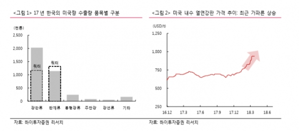 김윤상 하이투자증권 연구원은 27일 향후 철강산업과 관련 “품목별로 살펴보면 판재류 쿼터는 2017년 미국향 수출량 대비 111% 증가했으나, 강관류 쿼터는 104만톤으로 2017년 대비 약 50%가 감소했다”며 이 같이 전망했다.
