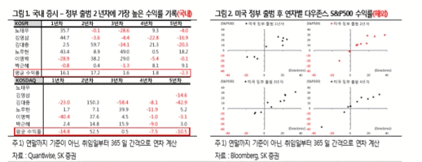 허 연구원은 “특이한 점은 증시에서 이와 같은 Cycle이 나타난다는 점이다. 한국 KOSPI와 KOSDAQ, 미국 Dow Jones와 S&P500의 정부 출 범 후 연차별 수익률을 계산해 봤을 때, 4가지 경우 모두 정부 출범 후 2년차 때 평균 수익률이 가장 높았다”며 “미국과 우리나라에서 공통적으로 나타나는 정부 출범 2년차의 높은 수익률, 문재인 정부 출범 후 1년이 지난 지금 눈여겨 볼 만하다고 생각한다”라고 밝혔다.
