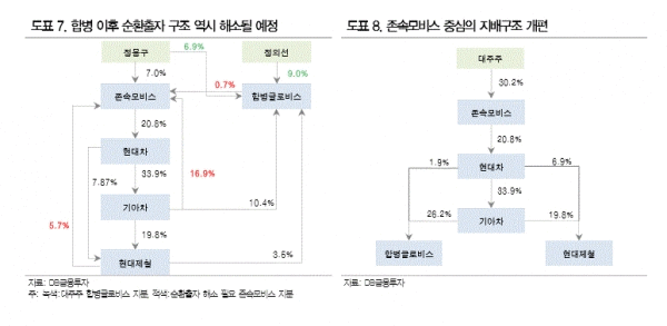 DB금융투자는 29일 최근 현대모비스 분할 및 합병 이사회 결의와 관련 ‘현대모비스 분할: Win Win’이라는 제목의 리포트에서 “주주 승인 시 기존 현대모비스는 존속모비스와 분할모비스로 각각 78%, 21%의 비율로 분할된다. 분할모비스는 다시 현대글로비스와 2.9대 1의 비율로 합병된다”며 “합병 이후 기아차, 현대제철 및 현대글로비스가 보유 중인 존속모비스 지분을 대주주 일가가 매입을 완료하게 되면 순환출자 구조 역시 자연스럽게 해소 된다”고 분석했다.