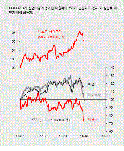 [일요주간=김완재 기자] “지금까지 미국 증시의 폭발적인 상승을 견인해온 'Tech Innovation' 랠리의 주역들, 소위 FAANG과 4차 산업혁명의 총아인 테슬라의 주가가 흔들리고 있다.“