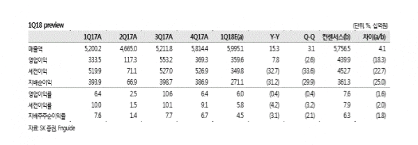 sk증권이 2일 ‘지난 2년 연속 실적 강세가 2018년에도 이어질 수 있을까?’라는 제목의 리포트에서 ”3월 30일 기준 컨센서스 4399억원 대비 –18.3% 하회하는 수치이다. 이익이 약세 국면에 진입한 원인은 유가와 환율에서 찾을 수 있으며 전분기 말 $65/bbl에 육박하던 Dubai유는 3월 초까지 $60/bbl 수준까지 하락했다“며 이 같이 밝혔다.