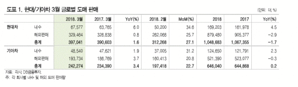DB금융투자는 3일 ‘3월 자동차 판매: 기저&신차 효과’라는 제목의 리포트에서 “현대차의 3월 글로벌 도매판매량은 39만 3000대로 내수 판매 강세와 전년 동월 중국 지역 기저효과로 1.6% 증가했다. 해외공장 및 국내 공장 수출 물량을 포함한 해외 도매 판매량은 32만 9000대(+0.8%YoY)를 기록 했다. 내수 판매는 수요 감소에도 불구하고 싼타페 신차 판매 강세에 힘입어 6만 8000대(+6.0%YoY)를 기록했다”고 밝혔다.