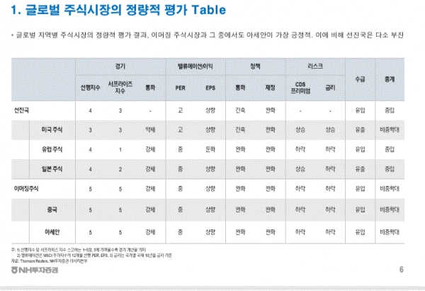 NH투자증권은 4일 글로벌 주식시장과 관련 ‘아세안, 보호무역 안전지대’라는 제목의 리포트에서 ”2~3월 글로벌 주식시장의 하락은 경기 펀더멘털이 아닌 일시적 요인 때문이다. 글로벌 경기 회복세가 지속되는 가운데, 물가는 완만하게 상승할 전망이다“며 ”또한 미국의 법인세율 인하 등의 효과로 기업 실적 모멘텀도 양호하다“며 이 깉이 분석했다.