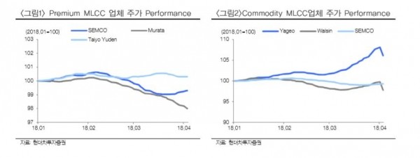 [일요주간=노현주 기자] “범용 MLCC 업체인 대만 업체들의 영업이익률은 2017년에 급상승하였고 주가도 함께 상승하고 있다. 반면에 1위 업체인 Murata는 MLCC 업황 호조에도 불구하고 스마트폰용 통신 Module의 수익성 악화로 주가는 약세를 보이고 있다.”