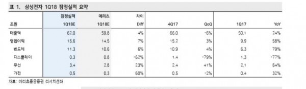 김선우 연구원은 “영업이익의 경우 부문별 세부 실적은 공개되지 않았으나 당사의 기존 예상 대비 반도체 부문에서 크게 상회한 것으로 추정된다”며 “IM 부문 역시 출시국 확대에 힘입어 갤럭시S9의 초기 Sell-in 출하 호조와 마케팅 비용 감축, 그리고 일부 일회성 이익이 반영됐다는 판단이다”고 밝혔다.