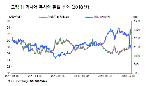 현대차투자증권은 16일 러시아의 경제에 대해 ‘제재와 냉전의 사이, 러시아는 어디로 향하고 있나?’라는 제목의 리포트에서 “미국의 무역제재 이후 2년 중 RTS 인덱스가 가장 크게 하락한 모습을 보였다. 지수의 급락 이후 일부 트레이더는 이를 투자기회로 보고 있지만 한편에서는 이러한 시각을 냉전 상황에 대한 안일한 판단으로 보고 있다”며 “1998년과 같이 서방과의 마찰이 모라토리움 사태로 번지고 러시아 경제를 붕괴시킬 수 있는 가능성도 배제할 수 없다”고 분석했다.