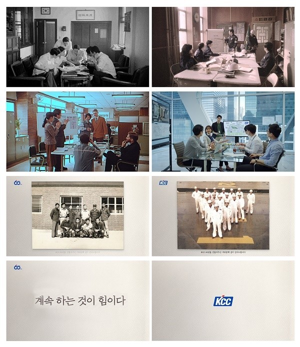 KCC는 17일 “KCC가 창립 60주년을 맞아 제작한 광고 '계속하는 것이 힘이다'편은 끊임없이 도전하며 대한민국 성장과 함께 해온 KCC의 모습을 창립 이후 현재까지 시대별 모습을 재현해 냈다”며 “지난 60년간 KCC의 성장을 이끌어 온 'KCC인'을 주인공으로 삼아 끊임없는 도전의 연속이었던 지난 세월을 포기하지 않고 열정과 끈기로 헤쳐 나온 사람들을 중심으로 KCC의 저력을 보여준다”고 밝혔다.