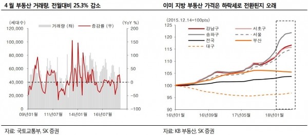 김세련 SK증권 연구원은 23일 '부동산 양극화의 시그널들'이라는 제목의 부동산 관련 리포트에서 "지난달 부동산 거래량은 4만6368세대로 전년동기대비 0.9% 감소해 전월대비 25.3% 감소한 것으로 나타났다"며 "올해 1분기 높은 입주 물량 집중에 따른 이사수요 증가 등으로 높았던 기저로 인해 감소 폭이 크게 나타나는 것으로 보인다"고 분석했다.