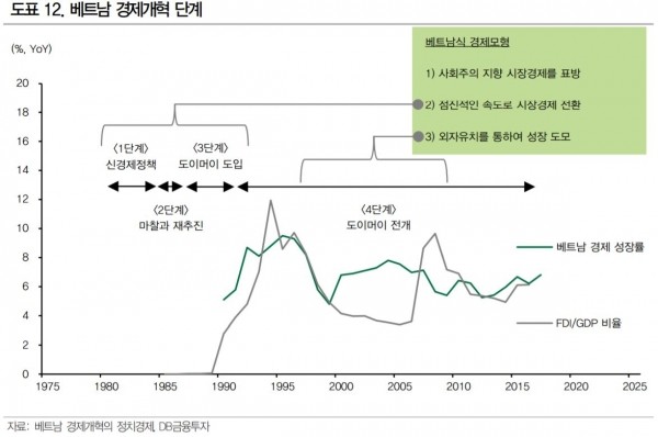 주목할 점은 점진적 속도로 체제 변화다. 베트남은 1980년 신경제정책 제시와 1986년 도이머이정책 선언에 이어 1990년대 소유제 구조 개혁까지 무려 13년에 걸쳐 체제 변화를 진행했다. 본격적 외자 도입이 이뤄진 것은 1993년부터다.