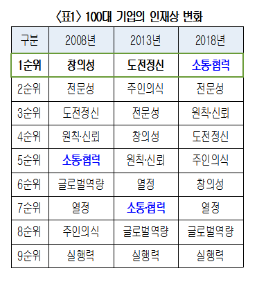 [일요주간 = 박용경 기자] 국내 100대 기업이 꼽은 인재의 첫 번째 덕목이 5년 전 ‘도전정신’에서 올해는 ‘소통과 협력’으로 바뀐 것으로 조사됐다.