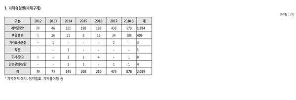 한국소비자원에서 제출한 ‘소비자 피해구제 현황’을 살펴보면 2012년부터 올해 8월까지 계약해제나 해지, 청약철회, 계약불이행 등으로 구제받은 건수가 1594건으로 가장 많았고, 부당행위 409건, 표시·광고 8건가 그 뒤를 이었다.