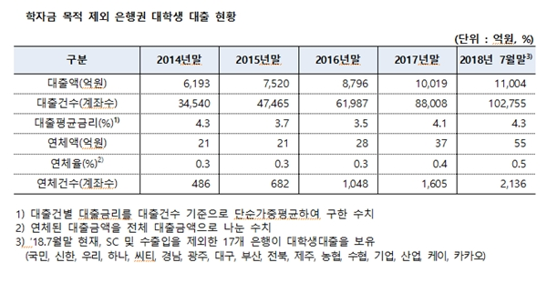 더불어민주당 김병욱 의원(정무위원회, 분당을)이 금융감독원으로 부터 제출받은 국정감사 자료에 따르면 대학생 대출 금액은 2014년 말 6,193억 원에서 4,811억 원(77.7%) 증가하여 2018년 7월 말 1조1천억 원을 기록하였다.
