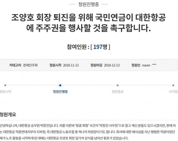 [일요주간=박민희 기자] 대한항공 직원연대지부 박창진 지부장은 청와대 청원게시판에 “조양호 회장 퇴진을 위해 국민연금이 대한항공에 주주권을 행사할 것을 촉구합니다”라는 제목의 청원을 게시하고, 대한항공의 정상화를 위해 국민연금이 적극 나서줄 것을 촉구하고 나서 주목된다.