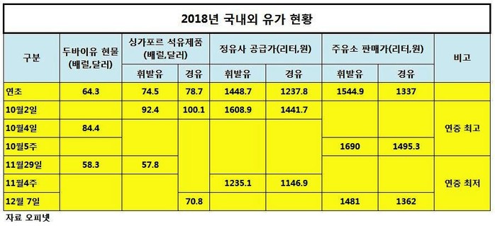 연초 리터당 휘발유가 1544.9원, 경유가 1337원이었으며, 연중 최고가인 10월 5주보다 각각 9.4%(145.1원), 11.8%(158.3원) 오르는데 그쳤다. 이어 유가가 하락하면서 12월 1주 가격은 각각 1481원, 1362원으로 최고가보다 12.7%(209원), 8.9%(133.3원) 내렸다.