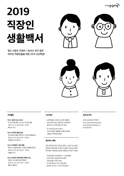 ‘2019 직장인 생활백서’는 오는 12일과 19일 KT&G 상상마당 홍대 아카데미에서 ‘업무역량’, ‘월급관리’, ‘인간관계’, ‘자아실현’을 주제로 4회에 걸쳐 진행된다.