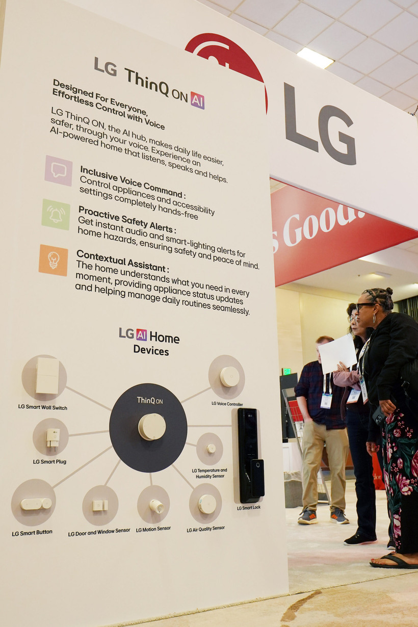AI홈 허브 씽큐 온(ThinQ ON)은 고객과 대화하며 생활 패턴을 학습·예측하고 집 안 가전이나 IoT 기기를 최적으로 제어한다. 씽큐 온과 연동해 문 열림 안내, 움직임 감지, 전력 모니터링이 가능한 IoT 센서는 청각장애인도 편리하게 사용할 수 있도록 소리 대신 빛으로도 알람을 제공한다.