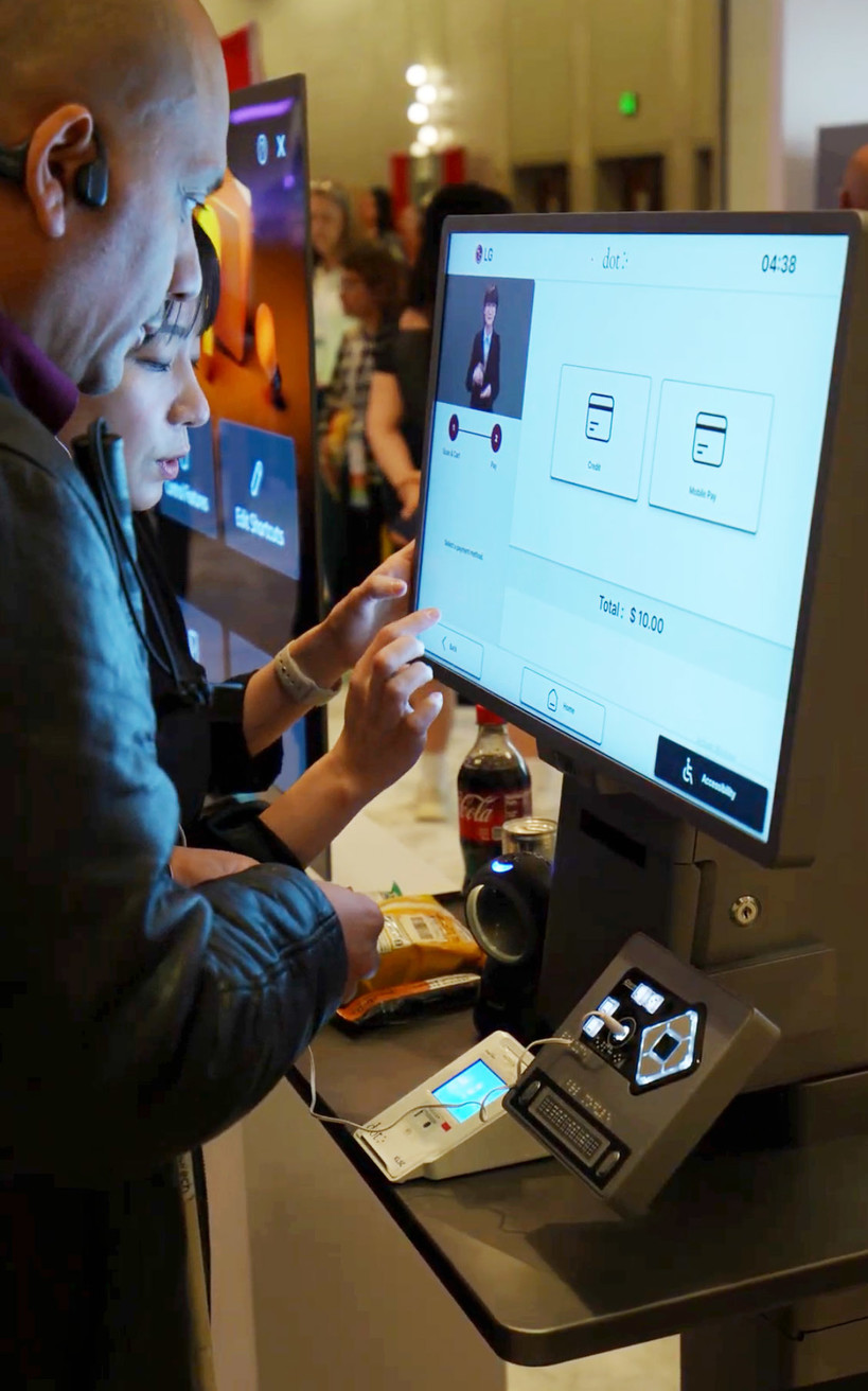 LG전자는 단독 전시부스를 마련하고 장애인, 시니어 고객의 접근성을 높이는 제품과 서비스를 관람객들이 직접 체험해 볼 수 있도록 했다. 올해 전시에는 점자기기 전문기업 닷(Dot)과 공동 개발한 키오스크 신제품을 처음으로 선보였다. 장애 고객들도 편리하게 사용할 수 있도록 점자패널, 수어안내, 스크린리더 등 다양한 접근성 기술을 통합 적용한 제품이다. 휠체어 사용자나 키가 작은 고객은 버튼을 눌러 키오스크 스탠드의 높낮이를 조절할 수 있다.