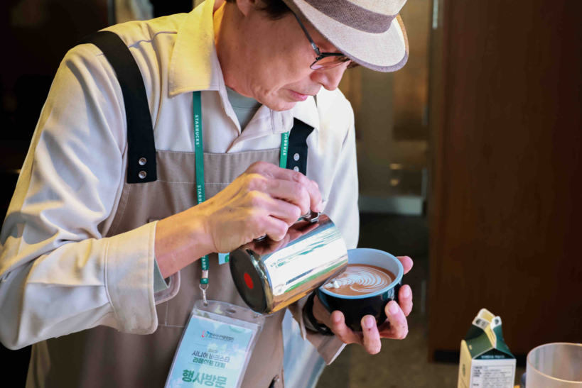 | ▲ 제4회 시니어 바리스타 라떼아트 대회에서 스타벅스 대표이사상을 수상한 대구북구시니어클럽 이제구 바리스타가 라떼아트를 하는 모습. (사진=스타벅스 코리아 제공) |
